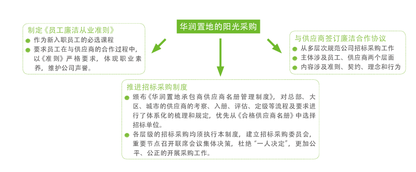 华润置地将《阳光宣言》、《廉洁合作协议》作为各项招标邀请的附件,100%覆盖合作方签署的合同,在向供应商发出招标邀请时即传达华润置地的诚信建设思想。只有认同华润置地《阳光宣言》、《廉洁合作协议》的供应商才有资格进行投标,中标单位均须签订《廉洁合作协议》。对于违反廉洁合作协议、不能有效履约的供应商,实行严格的淘汰制度,列入《不合格供应商名册》,不得参与项目投标,各项目的入围投标单位不得从《不合格供应商名册》中选择。